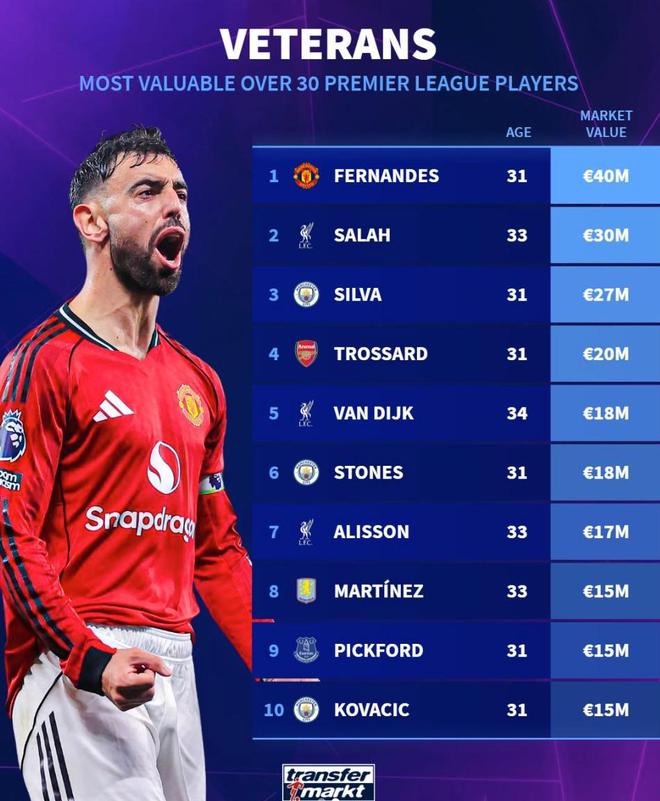 英超30岁以上球员身价榜:B费4000万欧第1,萨拉赫3000万第2